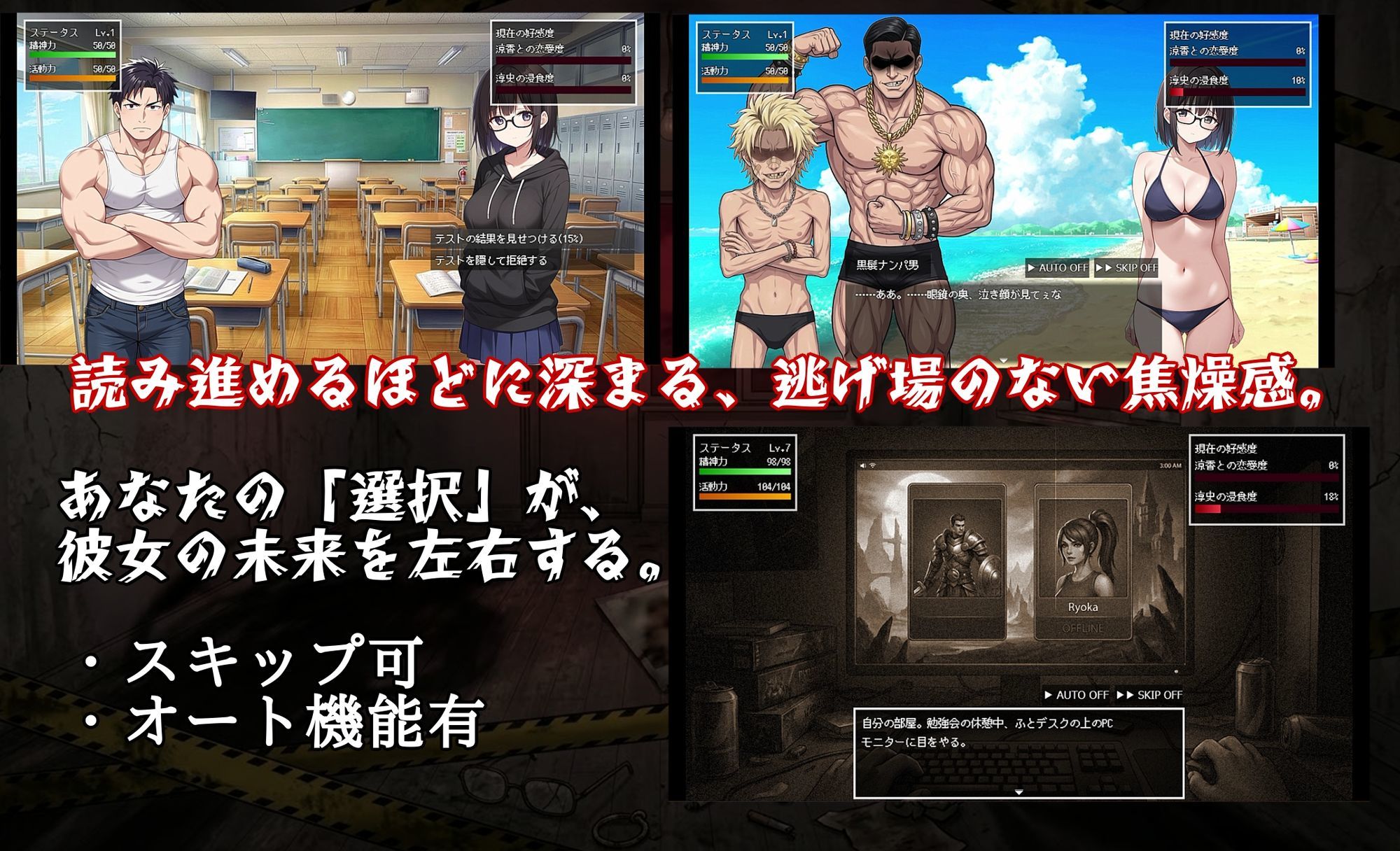 ・自分磨きとステータス: 「見た目」「魅力」「会話力」「知力」を鍛え上げ、淳史やその他モブの魔の手から彼女を死守せよ。ステータスが足りなければ、目の前で行われる蹂躙を止めることすら叶わない。 知力や特定のステータスが一定値を超えていないと選べない「ロックされた選択肢」も存在します。