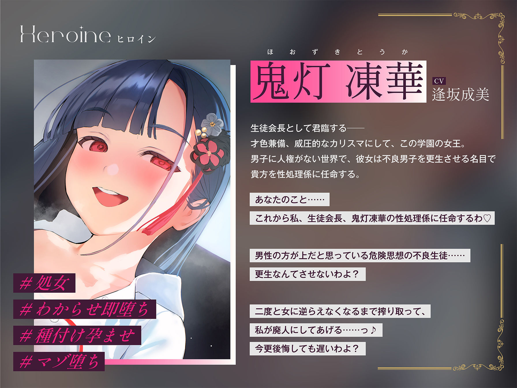 男に人権のない世界で、絶対的な権力を誇る生徒会長・鬼灯凍華(ほおずきとうか)。